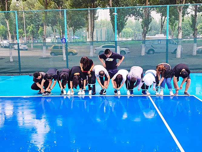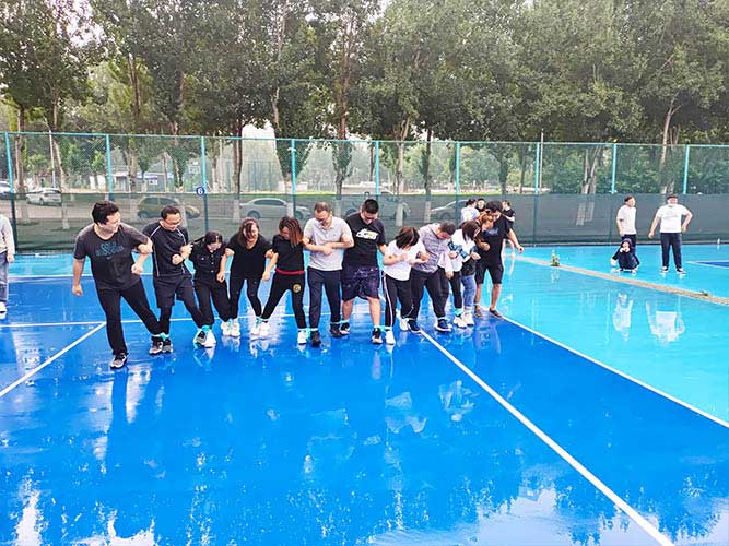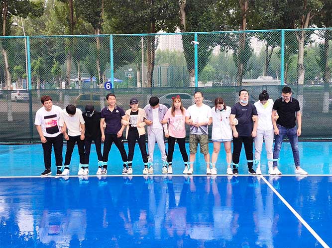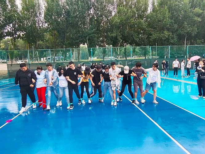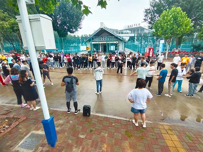 大家一排站好,從左到右,每人的右腿與另一人的左腿依次并齊,并用扁帶繩子系上,繩子綁的位置是腳踝以上部分。聽(tīng)見(jiàn)哨聲即為游戲開(kāi)始,從起點(diǎn)到終點(diǎn),按用時(shí)由短到長(zhǎng),取前五名依次加分。